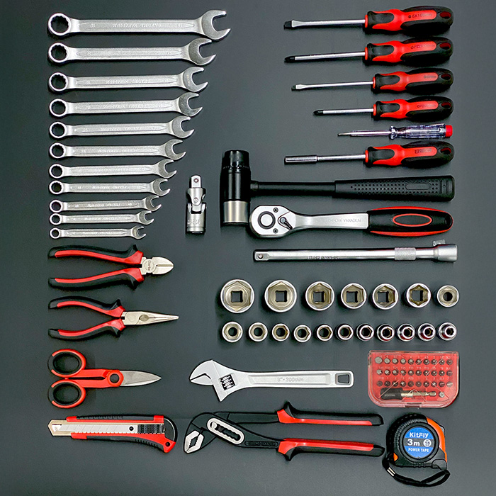 ●頑丈なスチール製の工具箱は、収納物を一覧できる両開きタイプの工具セット。